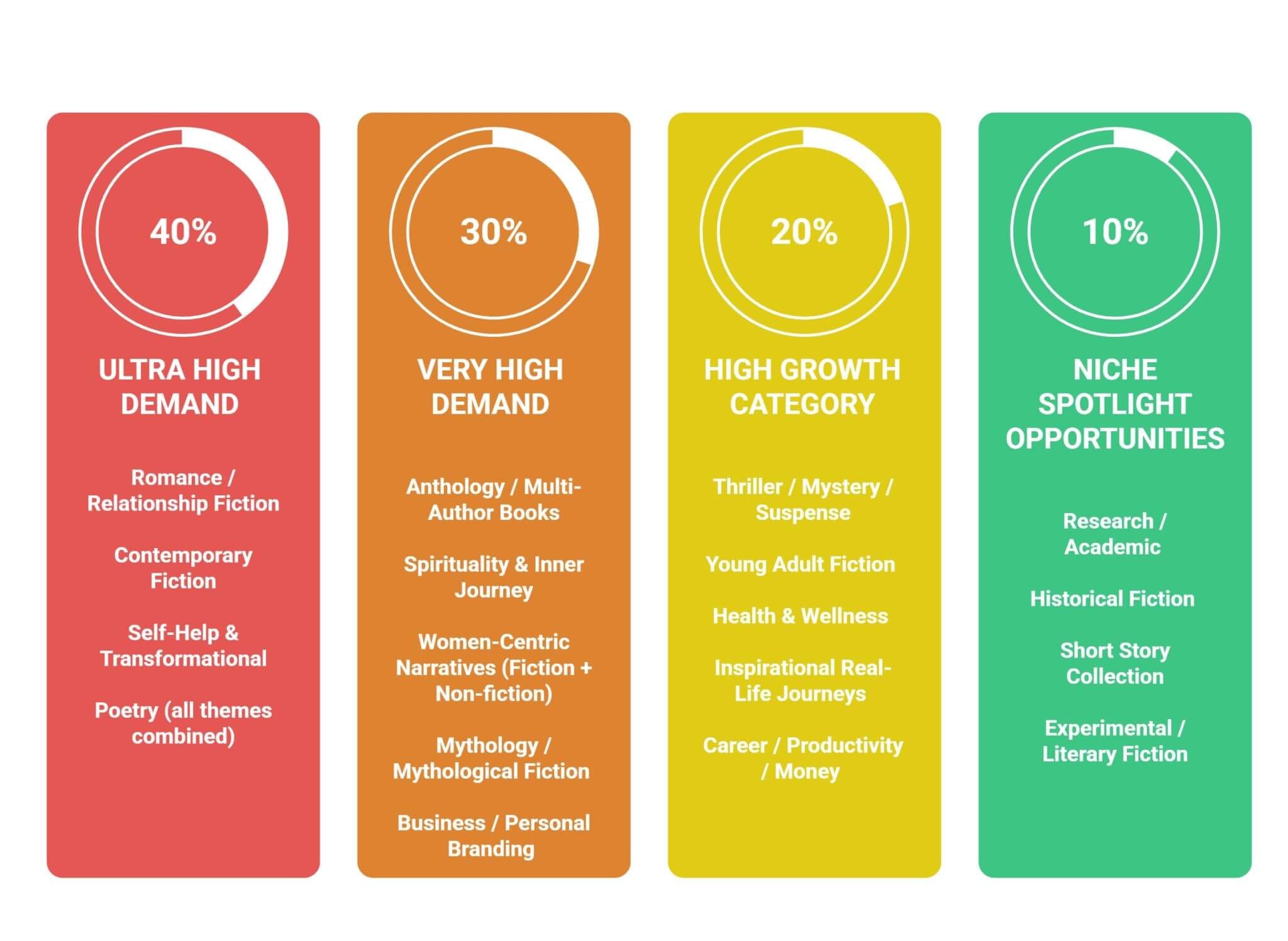 Another 30% of submissions fall under Very High Demand categories, including Anthologies, Spirituality, Women-centric narratives, Mythology, and Personal Branding books. These genres continue to see strong participation due to their wide appeal and collaborative publishing trends.